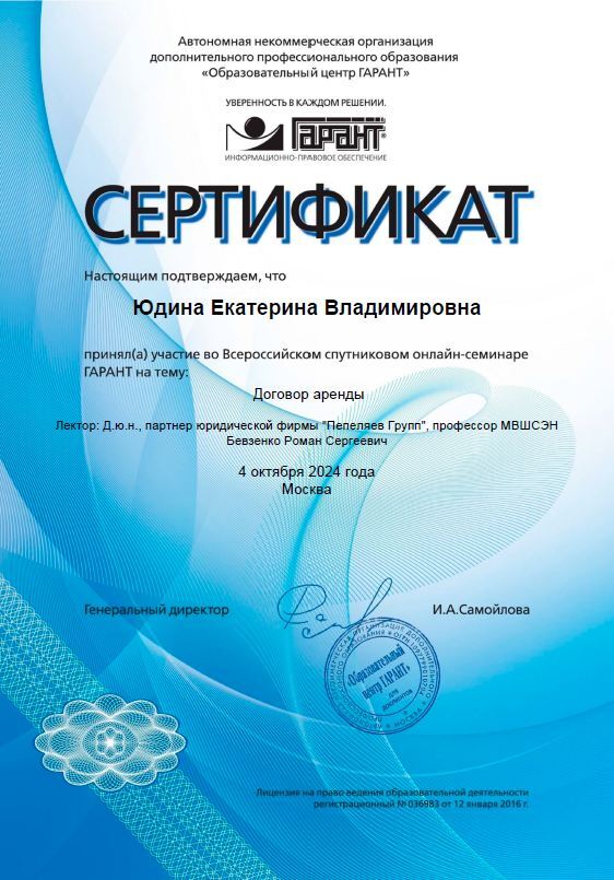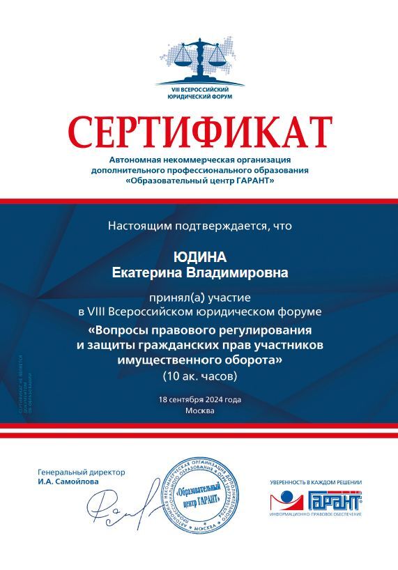 Мною принято участие в рассмотрении более 150 экономических и административных споров в арбитражных судах, и более 100 гражданских и административных дел (в порядке КАС РФ) в судах общей юрисдикции.